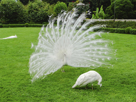 Description : They are also known as Leucistic Indian peacock are species native to the Indian subcontinent. They have a genetic condition called leucism, which causes pigment cells to fail to migrate from the neural crest during development. Leucistic peafowl can produce pigment but not deposit the pigment to their feathers, resulting in their blue-grey eye colour and the complete lack of colouration in their plumage. Leucistic peachicks are born yellow and become fully white as they mature.