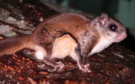 Description :Travancore flying squirrel also known as the small flying squirrel, is a flying squirrel found in South India and Sri Lanka. They are not capable of flight in the same way as birds or bats but are able to glide from one tree to another with the aid of a patagium, a furry, parachute-like membrane that stretches from wrist to ankle. Their long tail provides stability in flight. They are able to steer and exert control over their glide path with their limbs and tail. Flying squirrels are rare, nocturnal mammal with frugivorous diet, they are known to eat bark, shoots, and leaves, and even insects also.