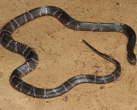 Description : The Common krait also known as Indian krait or blue krait is a species of venomous snake found in the jungles of the Indian subcontinent. It is a member of the "big four" species, inflicting the most snakebites on humans in India. The Common krait feeds primarily on other snakes, including: "blind worms". It also feeds on small mammals (such as rats, and mice), lizards and frogs. Kraits are nocturnal and their venom contains presynaptic and postsynaptic neurotoxins.