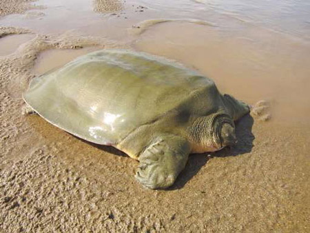 Description : The Asian giant softshell turtle also known as Cantor's giant softshell turtle or the frog-faced softshell turtle, is a freshwater turtle species native to Southeast Asia; listed as Endangered on the IUCN Red List. It has been considered to be among the largest extant freshwater turtles. The species is an ambush predator and primarily carnivorous, feeding on crustaceans, mollusks and fish (although some aquatic plants may also be eaten). The turtle spends 95% of its life buried and motionless, with only its eyes and mouth protruding from the sand. It surfaces only twice a day to take a breath.