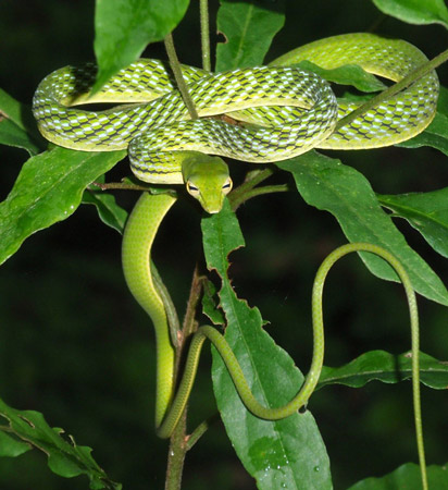 Description : The Green vine snake also known as long-nosed whip snake, is a slender green tree snake found in India, Sri Lanka, Bangladesh, Burma, Thailand, Cambodia and Vietnam. The Green vine snake is diurnal and mildly venomous. This arboreal snake normally feeds on frogs and lizards using its binocular vision to hunt. They are viviparous, giving birth to young that grow within the body of the mother, enclosed within the egg membrane.
